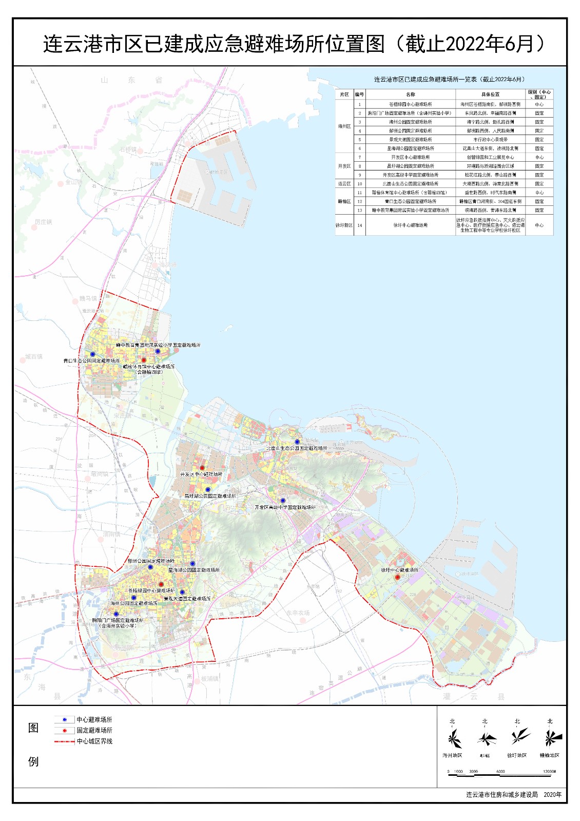 截至2022年6月,连云港市区已建成应急避难场所14处。根据《中华人民共和国防震减灾法》《江苏省防震减灾条例》以及省级安全发展示范城市创建工作等相关规定,现将市区已建成应急避难场所位置信息公示如下: